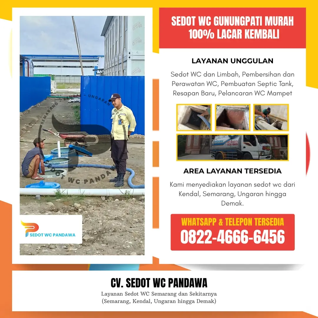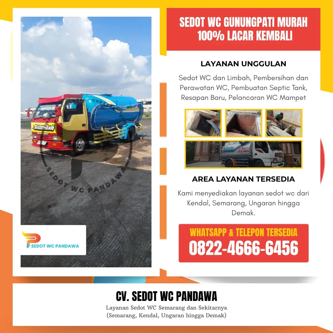 Sedot WC Gunungpati dari CV. Sedot WC Pandawa adalah solusi profesional untuk mengatasi masalah limbah dan saluran mampet di wilayah Gunungpati. Dengan pelayanan yang cepat, bersih, dan tuntas, kami memberikan Jaminan 100% Lancar Kembali untuk mengembalikan kenyamanan lingkungan Anda. Hubungi kami untuk mendapatkan layanan terbaik.