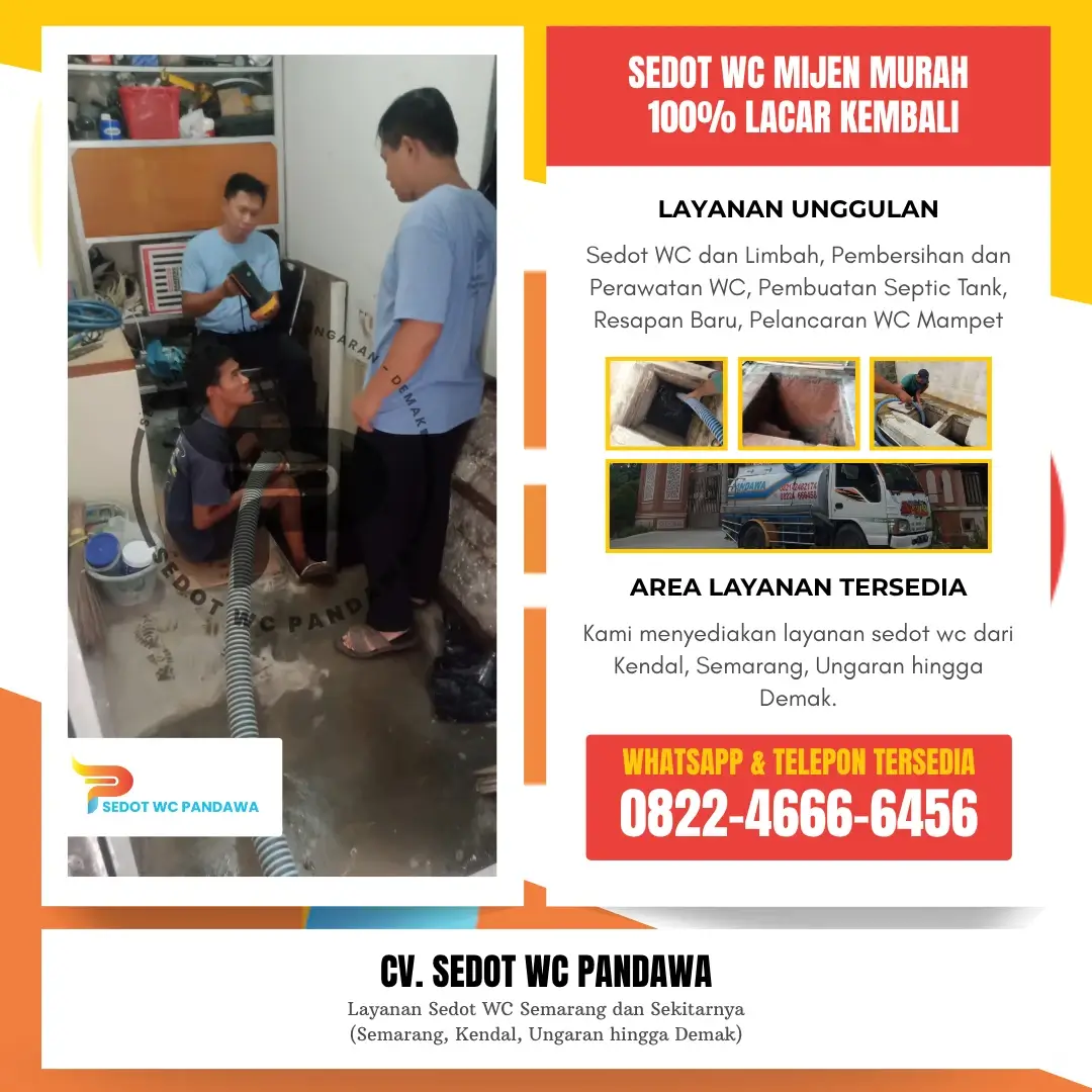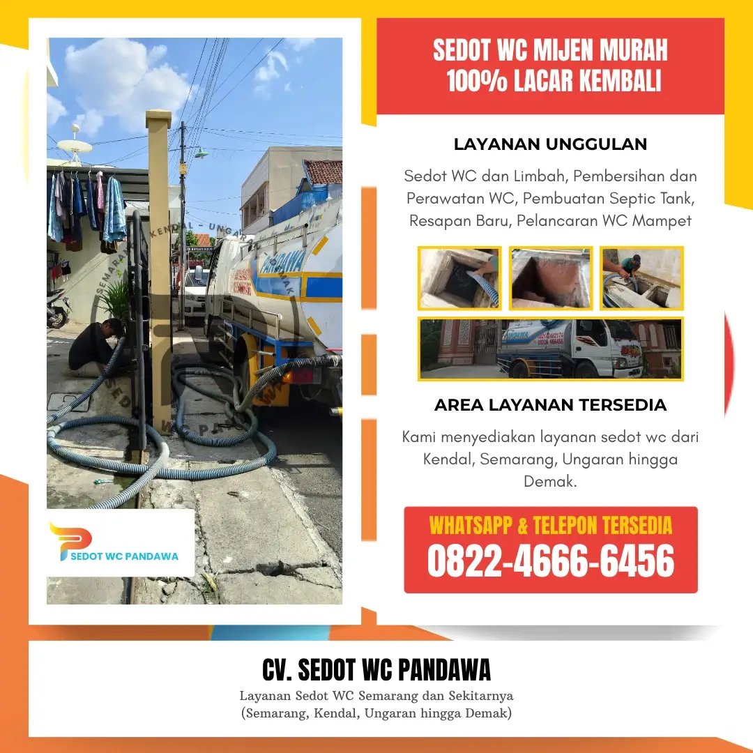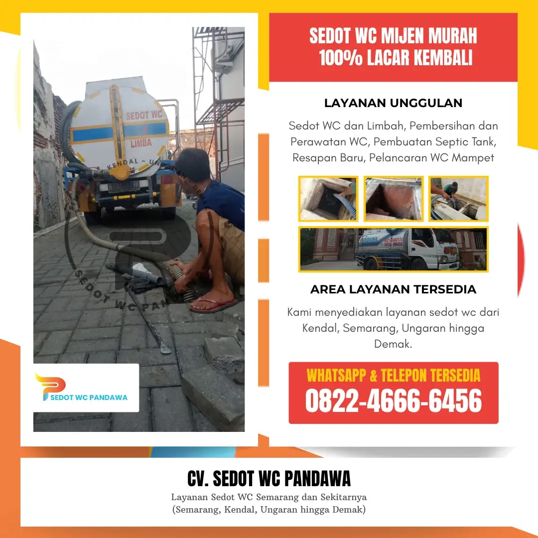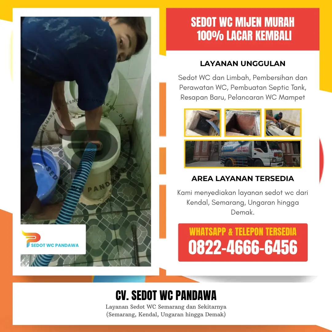 CV. Sedot WC Pandawa telah berpengalaman dalam memberikan layanan sedot WC Mijen yang profesional dengan tenaga ahli yang terlatih dan peralatan modern. Kami selalu mengutamakan kepuasan pelanggan dengan pelayanan cepat, bersih, serta harga yang transparan. Selain itu, kami juga melayani berbagai kebutuhan terkait perawatan saluran air, perbaikan septic tank, hingga pembersihan limbah rumah tangga maupun industri.