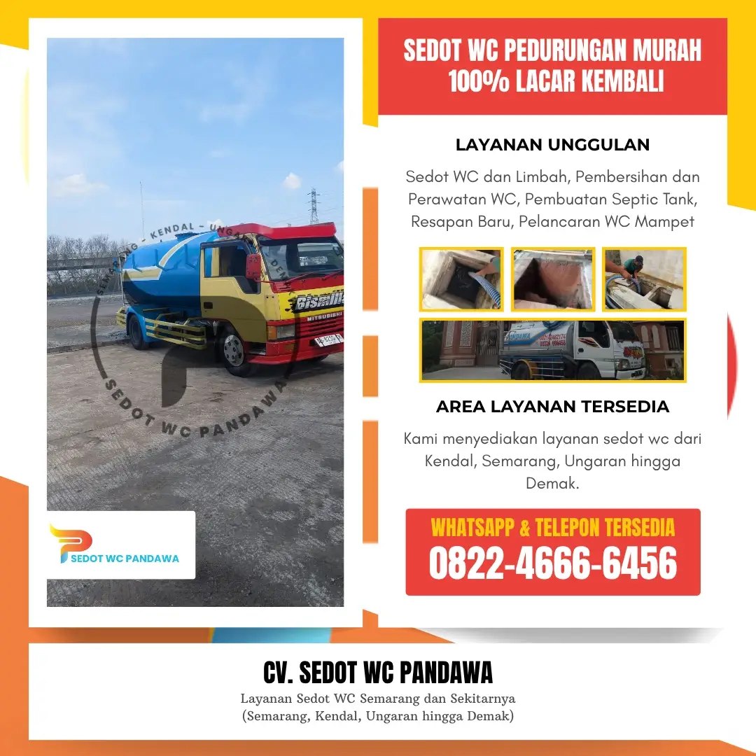 Sedot WC Pedurungan dari CV. Sedot WC Pandawa adalah solusi profesional untuk mengatasi masalah limbah dan saluran mampet di wilayah Pedurungan. Dengan pelayanan yang cepat, bersih, dan tuntas, kami memberikan Jaminan 100% Lancar Kembali untuk mengembalikan kenyamanan lingkungan Anda. Hubungi kami untuk mendapatkan layanan terbaik.